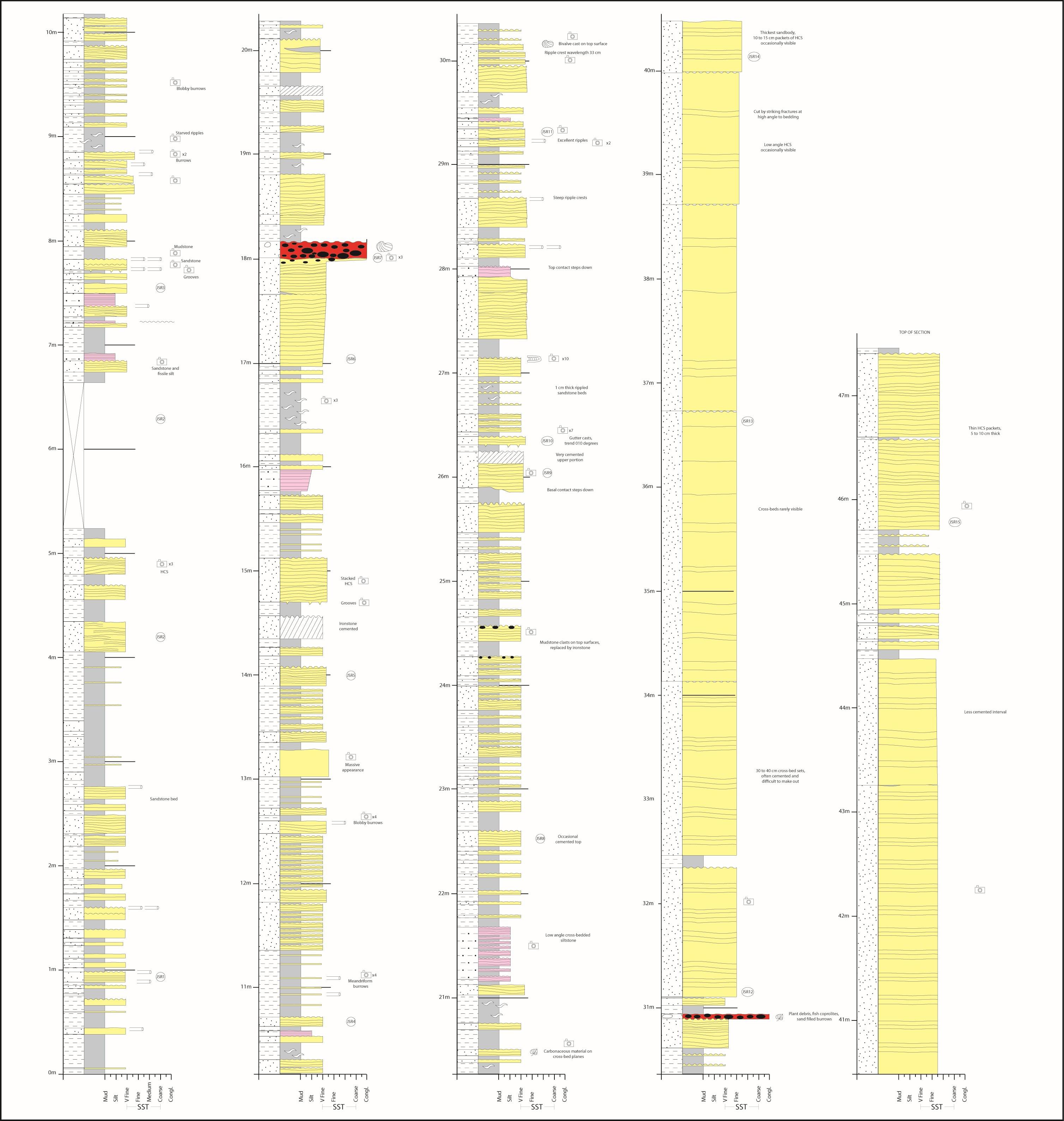 Logged section through the stratigraphy exposed. The bottom of the section is on the bottom left of the figure.