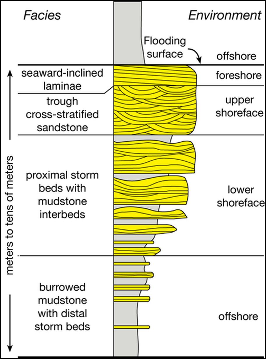 Lower shoreface Hummocky crossstratified sandstone beds (HCS), interbedded with mudstones at depth but becoming thicker and stacked as the water shallows. May feature gutter casts