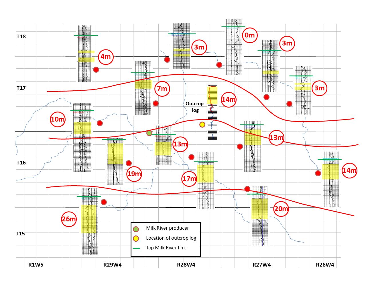 Figure 10. Interpreted isopach map of Milk River shoreface intersections (each square measures 1 mile)