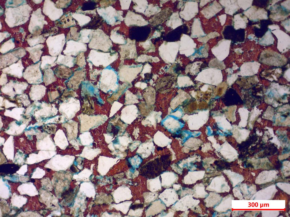 There is a significant variation in the degree of cementation through the outcrop (Photos S and T). A few beds are clearly cemented by siderite, with a characteristic rusty stain. The thin sections show varying levels of calcite cementation. The thick 13 m sandstone package appears to have been significantly cemented, while a sandstone bed at around 14 m appears to show the best porosity. There is no obvious pattern to the degree of cementation of particular beds with the exception of the pervasive cementation of the thick sandstone package. The thinner beds exhibit vertical fractures spaced at 10 to 20 cm.