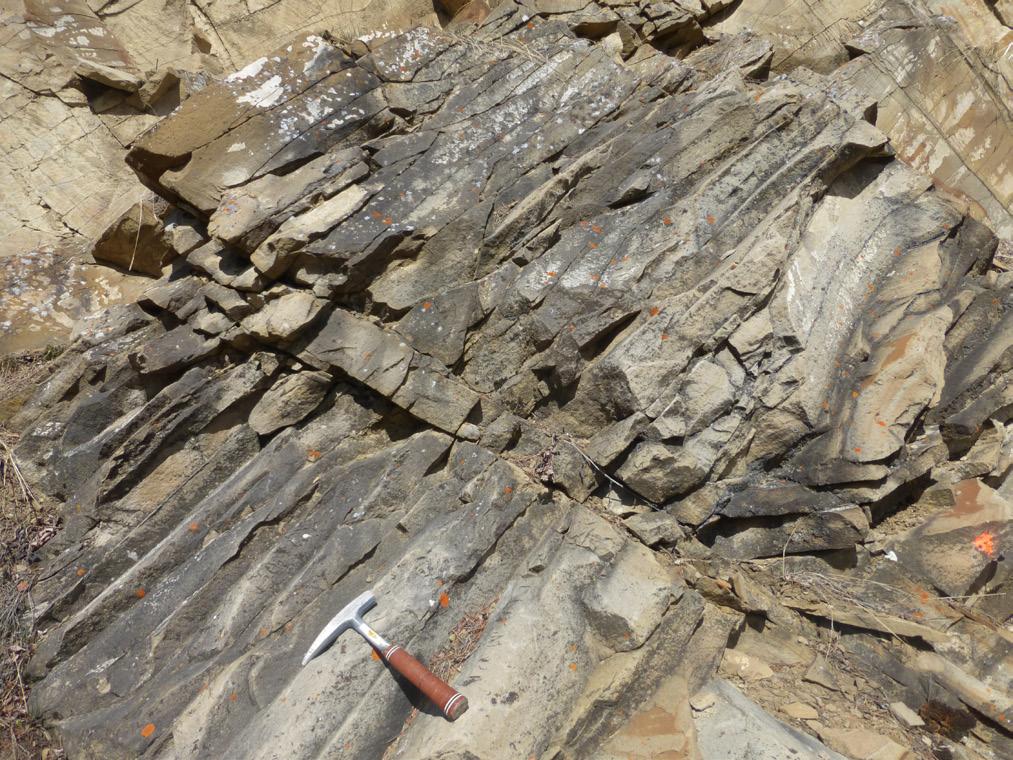The succession shows an overall coarsening upward trend, which is also picked out by the handheld gamma ray readings (Photo R), seen in the logs in Figure 8. The lower muddier portion, with associated thin storm beds and starved ripples (Photos B, C and F), is interpreted to have been deposited in a distal lower shoreface setting. The occasional pulses of thicker sandstone beds may relate to delta lobe switching during deposition. The ubiquitous hummocky cross-stratification (HCS) is interpreted to show that these are tempestite (storm related) deposits. There is a shallowing event at 18 m followed by a transgression, leading to reworking of the sediment, concentrating an extraformational lag or ravinement surface comprising pebbles and oysters (Photo I). A ravinement surface is a surface of erosion that forms in shallow-water coastal settings as a shoreline migrates landward during a transgression (rising relative sea level).