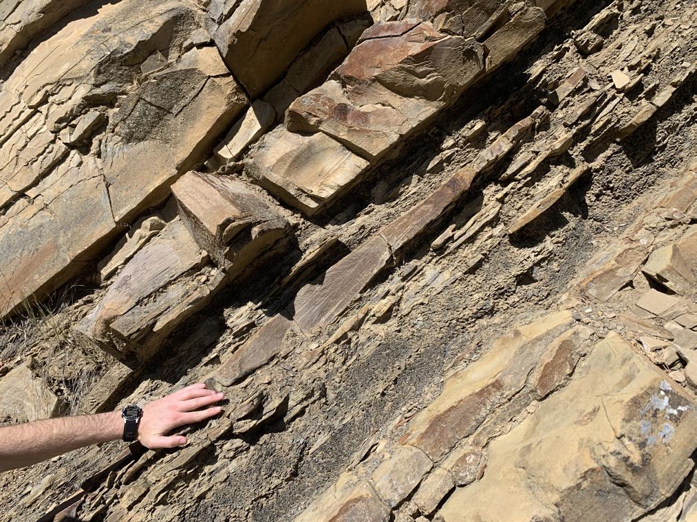 The Sheep River region, located in the rolling foothills portion of the Rocky Mountains, is cut by numerous folds and thrusts related to the mountain building. This has led to the juxtaposition of a series of northwest-southeast oriented, thrust bounded fault blocks of dominantly Cretaceous age. Our focus is on a slice of the Milk River Formation, located some 15 km to the west of Diamond Valley in Alberta. The Milk River Formation is a nearshore to terrestrial sedimentary unit deposited during the Late Cretaceous (late Santonian to early Campanian) in southern Alberta. It is equivalent to the Lea Park Formation of eastern Alberta. Radiometric dating places it at 84.5 to 83.5 Ma (Weblex Canada 2008; Wikipedia 2025).
