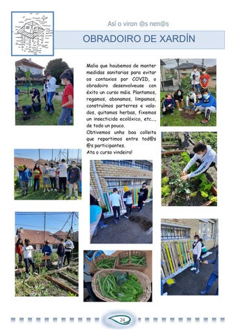 OBRADOIRO DE XARDÍN Malia que houbemos de manter medidas sanitarias para evitar os contaxios por COVID, o obradoiro desenvolveuse con éxito un curso máis. Plantamos, regamos, abonamos, limpamos, construímos parterres e valados, quitamos herbas, fixemos un insecticida ecolóxico, etc..., de todo un pouco. Obtivemos unha boa colleita que repartimos entre tod@s @s participantes. Ata o curso vindeiro!