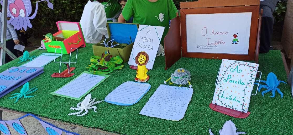 Por grupos, os alumnos e alumnas de 4º de primaria creamos diversos contos, que expuxemos e lemos a tódolos asistentes. Cada grupo escolleu a súa forma de presentación: libros tamaño A4, A5 e ata un Kamishibai.