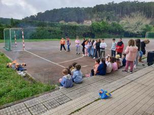 En abril tivemos un encontro co CEIP de Castrelo, onde tamén houbo xogos. Comezamos a xornada no Mosteiro da Armenteira onde o noso alumnado explicoulle diferentes cousas do Mosteiro aos rapaces de Castrelo; e xa na nosa escola fixemos dous talleres: un relacionado co xogo e educación física e outro xogando coa arte inspirándonos en Manolo Paz.