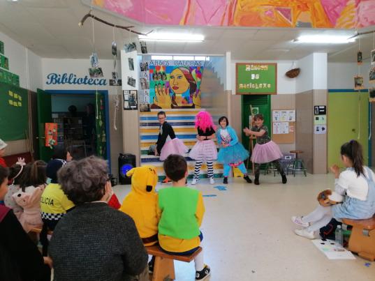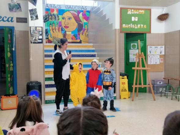 Deseguido a rapazada de 1º,2º e 3º de primaria cantou e dramatizou o divertido e porcalleiro conto “A toupiña que quería saber quen lle fixera aquilo na cabeza”. Por último as rapazas e rapaces de 4º,5º e 6º, interpretaron o poema musicado “Al rico trasto” do fermoso poemario “Trastario” de Pedro Mañas.