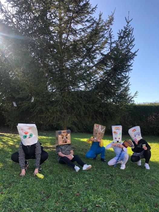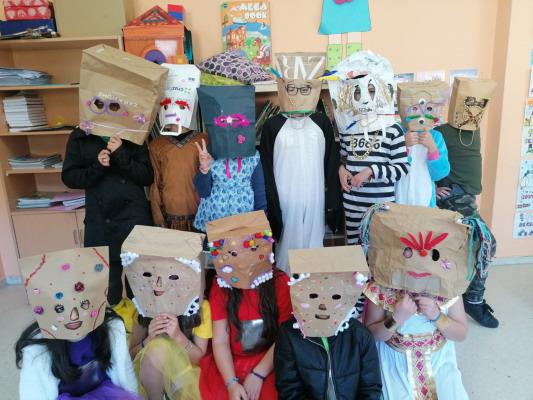 No entroido fixemos un taller de máscaras con bolsas de papel e antefaces con cartón.