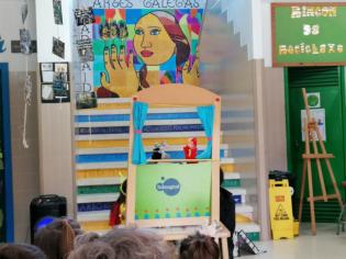O martes 18 foi o turno dos apadriñamentos lectores, actividade que coñecimos grazas á visita que fixemos ao cole de Castrelo. Consiste en que un neno maior apadriñe a un máis pequeno para contarlle un conto nun recuncho acolledor do patio. Ademais tivemos sorte, porque tocounos un día espléndido.