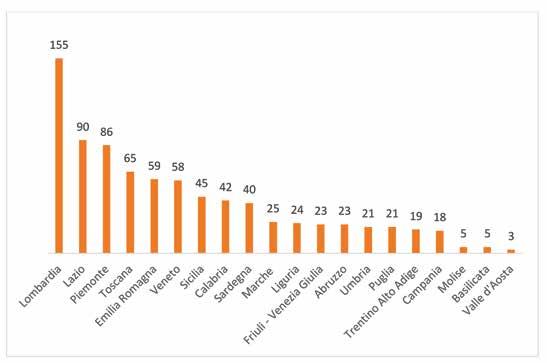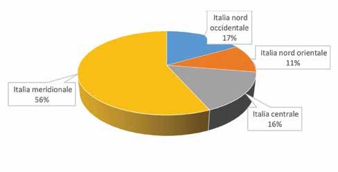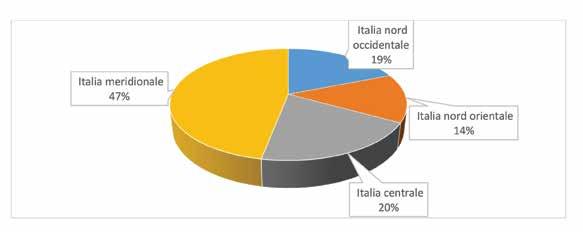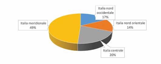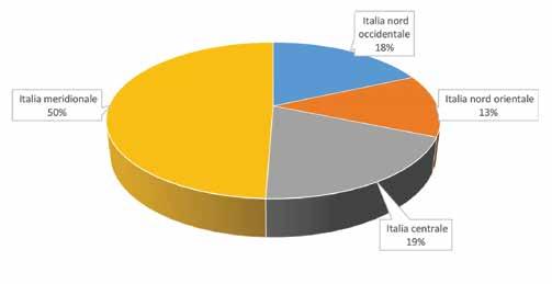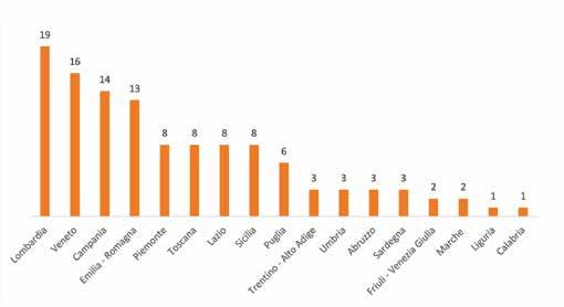 Regioni Numero % Valle d'Aosta -Piemonte 8 6,8 Liguria 1 0,8 Lombardia 19 16,1 Nord Ovest 28 23,7 Trentino Alto Adige 3 2,5 Veneto 16 13,6 Friuli - Venezia Giulia 2 1,7 Emilia Romagna 13 11,0 Nord Est 34 28,8 Toscana 8 6,8 Umbria 3 2,5 Marche 2 1,7 Lazio 8 6,8 Centro 21 17,8 Abruzzo 3 2,5 Molise -Puglia 14 11,9 Campania 6 5,1 Basilicata -Calabria 1 0,8 Sicilia 8 6,8 Sardegna 3 2,5 Sud 35 29,7 ITALIA 118 100,0