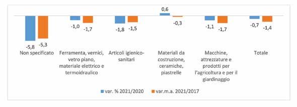 Var. % Var.m.a. Categorie di prodotto 2017 2018 2019 2020 2021 2021/2020 2021/2017 Non specificato 583 558 526 498 469 -5,8 -5,3 Ferramenta, vernici, vetro piano, materiale elettrico e termoidraulico 20.096 19.685 19.171 18.977 18.780 -1,0 -1,7 Articoli igienico-sanitari 1.630 1.631 1.578 1.561 1.533 -1,8 -1,5 Materiali da costruzione, ceramiche, piastrelle 9.598 9.538 9.489 9.444 9.500 0,6 -0,3 Macchine, attrezzature e prodotti per l'agricoltura e per il giardinaggio 8.289 8.193 7.988 7.816 7.732 -1,1 -1,7 Totale 40.196 39.605 38.752 38.296 38.014 -0,7 -1,4