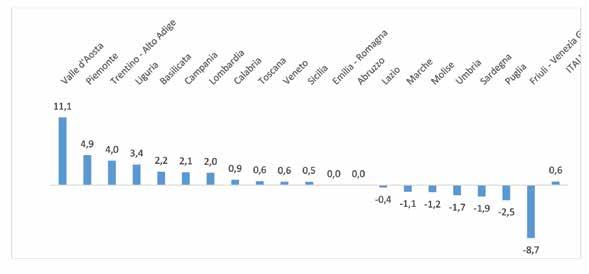 Var. % Var.m.a. Regioni 2017 2018 2019 2020 2021 2021/2020 2021/2017 Valle d'Aosta 2 3 3 3 3 - 10,7 Piemonte 80 75 67 66 69 4,5 -3,6 Liguria 50 54 51 47 46 -2,1 -2,1 Lombardia 165 162 158 144 138 -4,2 -4,4 Italia nord occidentale 297 294 279 260 256 -1,5 -3,6 Trentino - Alto Adige 16 17 14 12 12 - -6,9 Veneto 75 73 70 76 84 10,5 2,9 Friuli - Venezia Giulia 20 20 19 19 18 -5,3 -2,6 Emilia - Romagna 57 60 58 59 53 -10,2 -1,8 Italia nord orientale 168 170 161 166 167 0,6 -0,1 Toscana 58 61 58 56 58 3,6Umbria 25 24 23 20 22 10,0 -3,1 Marche 37 38 37 37 32 -13,5 -3,6 Lazio 146 145 143 142 130 -8,5 -2,9 Italia centrale 266 268 261 255 242 -5,1 -2,3 Abruzzo 38 37 35 34 32 -5,9 -4,2 Molise 10 10 10 10 11 10,0 2,4 Campania 212 213 207 212 210 -0,9 -0,2 Puglia 196 193 189 196 186 -5,1 -1,3 Basilicata 17 18 17 17 15 -11,8 -3,1 Calabria 101 98 99 96 97 1,0 -1,0 Sicilia 285 290 284 279 279 - -0,5 Sardegna 40 40 36 36 38 5,6 -1,3 Italia meridionale 899 899 877 880 868 -1,4 -0,9 ITALIA 1.630 1.631 1.578 1.561 1.533 -1,8 -1,5