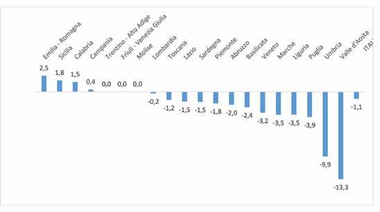 Trentino - Alto Adige 75 70 69 65 65 - -3,5 Veneto 613 600 588 565 547 -3,2 -2,8 Friuli - Venezia Giulia 139 135 127 127 127 - -2,2 Emilia - Romagna 464 460 437 405 415 2,5 -2,8 Italia nord orientale 1.291 1.265 1.221 1.162 1.154 -0,7 -2,8 Toscana 578 560 553 566 559 -1,2 -0,8 Umbria 220 221 220 213 192 -9,9 -3,3 Marche 288 298 286 257 248 -3,5 -3,7 Lazio 765 760 754 737 726 -1,5 -1,3 Italia centrale 1.851 1.839 1.813 1.773 1.725 -2,7 -1,7 Abruzzo 260 260 257 253 248 -2,0 -1,2 Molise 89 85 81 88 88 - -0,3 Campania 845 840 834 822 825 0,4 -0,6 Puglia 696 665 638 646 621 -3,9 -2,8 Basilicata 187 189 182 170 166 -2,4 -2,9 Calabria 664 663 670 674 684 1,5 0,7 Sicilia 901 885 862 853 868 1,8 -0,9 Sardegna 420 426 423 391 385 -1,5 -2,2 Italia meridionale 4.062 4.013 3.947 3.897 3.885 -0,3 -1,1 ITALIA 8.289 8.193 7.988 7.816 7.732 -1,1 -1,7