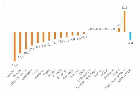 ESERCIZI IN SEDE FISSA SPECIALIZZATI NEL COMMERCIO DI ARTICOLI PER IL FAI DA TE. VARIAZIONE PERCENTUALE 2024/2023 DEL SETTORE PER REGIONE
