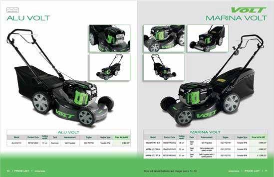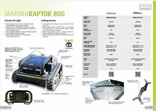 Marina Systems presenta tre cataloghi: quello generale dove si possono trovare i rasaerba prodotti da Marina Systems, il modello Raptor 800, i decespugliatori, i prodotti multifunzione e gli arieggiatori; il catalogo Trattori compatti Captain e il catalogo Marina Volt, la serie di prodotti a batteria prodotti da Marina.