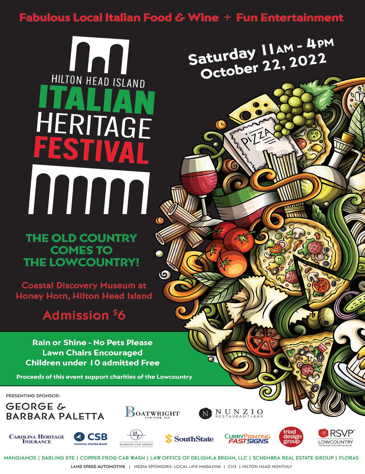 The Italian-American Club of Hilton Head Island, a local nonprofit organization, is proud to announce that the twelfth annual Italian Heritage Festival will be held Saturday, October 22 at the Coastal Discovery Museum at Honey Horn, on Hilton Head Island. Offering something for everyone, the festival grows each year, expanding on the Italian-American cultural experience with food, wine, and live music. In keeping with the community focus, proceeds from the Italian Festival go to local charities and scholarships.