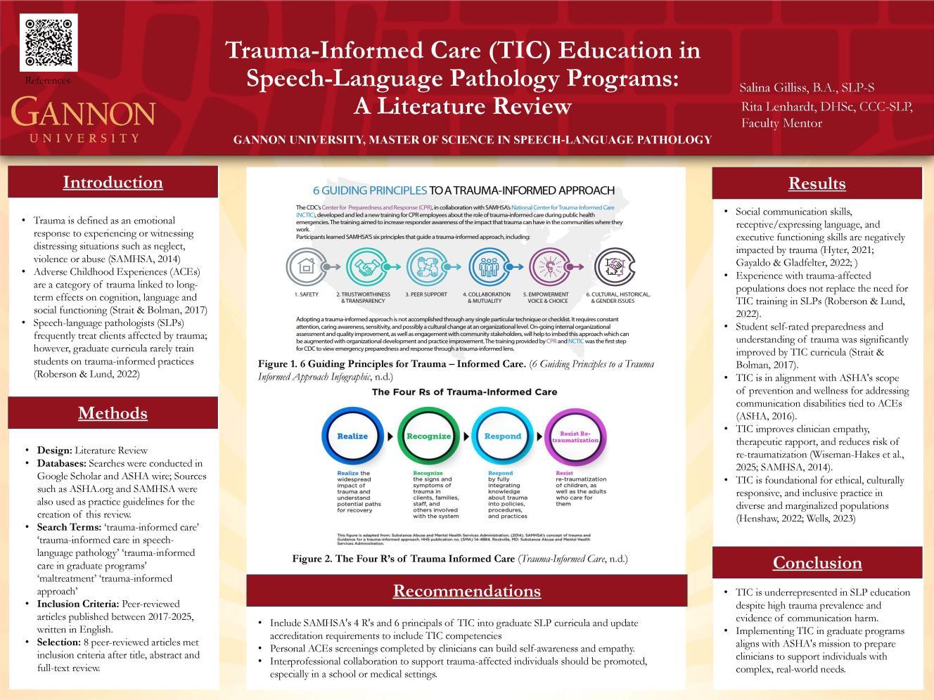 Abstract: Trauma-Informed Care (TIC) is widely recognized in healthcare but remains underexplored in Speech-Language Pathology (SLP). Given the impact of trauma on cognition, communication, and emotional regulation, integrating TIC into SLP practice is essential. This literature review examines the current application of TIC in the field, identifies gaps in education and training, and explores strategies for incorporation into SLP graduate programs. Using frameworks such as the Substance Abuse and Mental Health Services Administration’s (SAMHSA) TIC model, this review highlights the potential benefits of a trauma-informed approach in clinical practice. Findings suggest a need for further research and curricular development to ensure SLPs are prepared to provide sensitive, client-centered care.