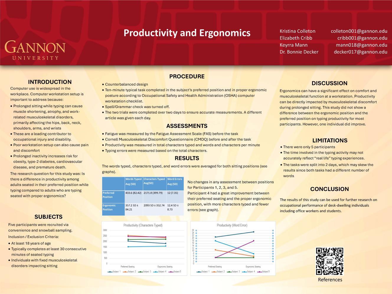 Abstract: The impact that sitting ergonomics has on typing productivity within the workplace or classroom was examined in 5 participants. This study used a repeated-measures case study design, with working-aged adults completing a typing task in both a preferred and an ergonomically correct seated position that followed OSHA guidelines. Participants were obtained through convenience sampling of Gannon University’s faculty and students. The results did not show a significant difference between the ergonomic position versus the preferred position on typing productivity. Further research should be done to expand knowledge of the impact that proper sitting ergonomics has on occupational performance.