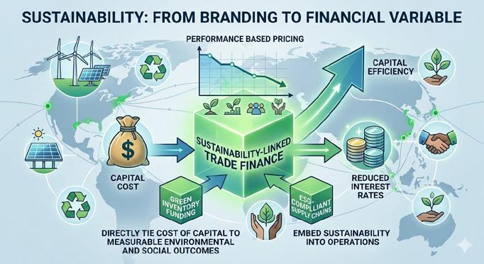 New financing structures are emerging in response. Sustainabilitylinked trade finance ties pricing or availability of capital to measurable ESG outcomes. Green inventory financing supports commodities with certified sustainable sourcing. Enhanced reporting and disclosure standards—often aligned with global frameworks—are becoming embedded within financing agreements. ESG-adjusted margin pricing reinforces a critical shift: sustainable behavior is not just ethically important, it is financially