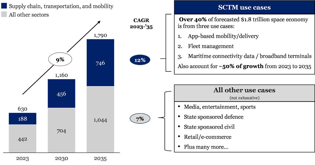 For the SCTM sector, these use cases could emerge in three main areas – fleet management, marine connectivity and app-based mobility and delivery. Around 50% of space economy growth in 202335 is projected to come from these three areas.