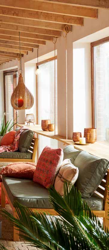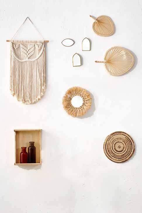 Kussens, kaarsen, warme tinten en ... prachtige muurdecoratie. Op basis van natuurlijke materialen, zonder te veel tierlantijntjes, maar wel ideaal om onderling te combineren.