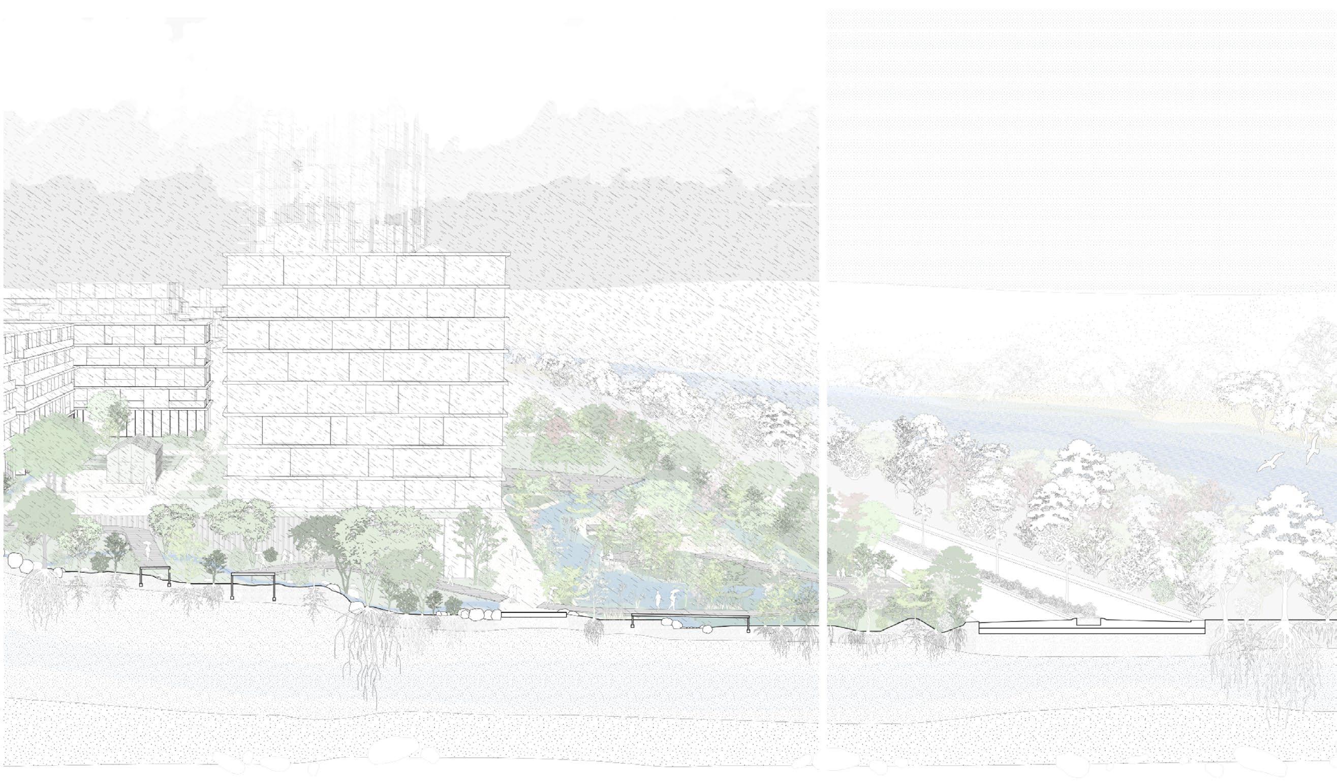 The project transforms the Var’s riverside into a bold urban landscape that seamlessly integrates water management and city life. Buildings are set back into the natural slope, creating a unique transition zone that embraces the river while reclaiming the waterfront for people. This reimagined space offers not just protection against floods but a new way for residents to engage with their environment.