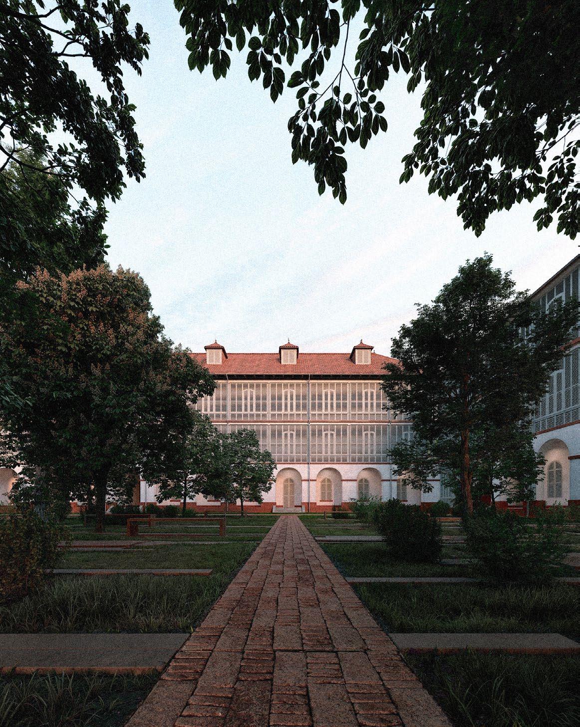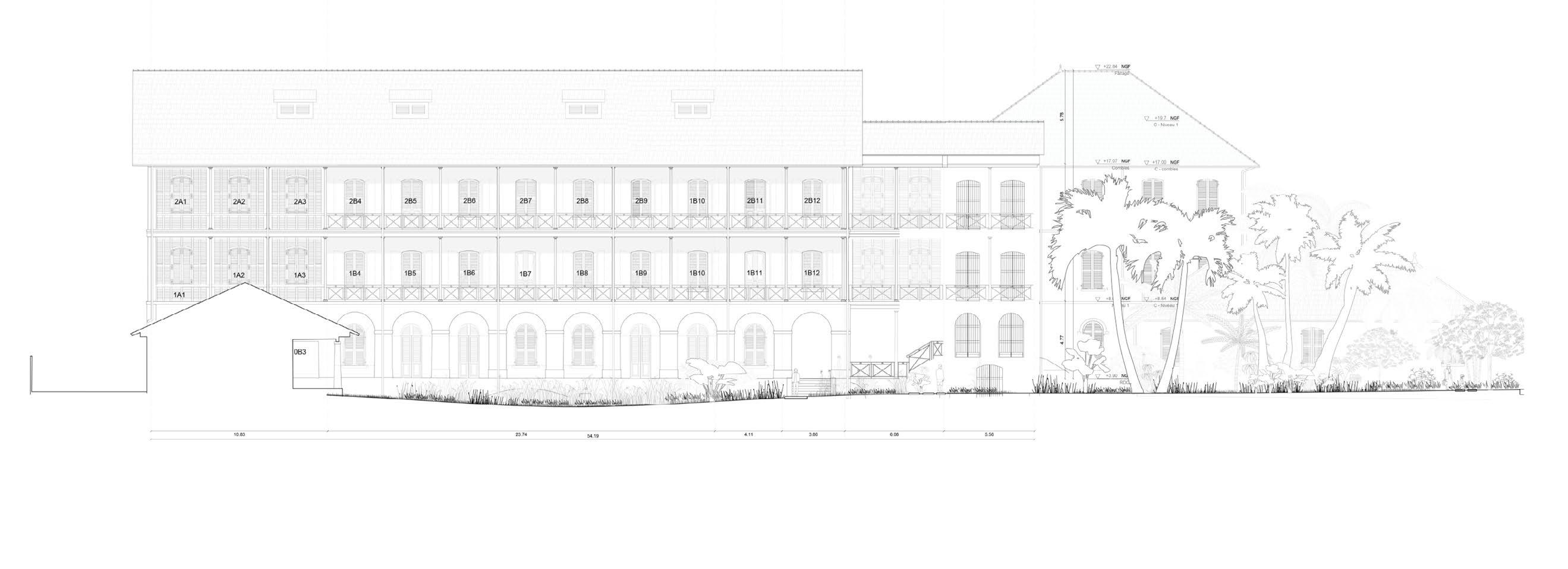 The Garden of Memories is a place of remembrance inspired by the mangrove trunks that wash up and accumulate in cycles on the beach adjacent to the museum. In keeping with the spirit of the place and the poetry of serendipity, the contemporary layout of criss-crossing and accumulating slats reinterprets this natural motif. Lying on the ground between the ocean and the hospital, these elements symbolize time, and thus the effect of the elements on a site that has marked and been marked by Guyanese history. Local trees and rocks occasionally emerge to form a shady Guyanese landscape, in which benches welcome visitors for a moment of contemplation.