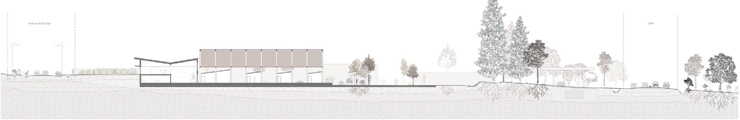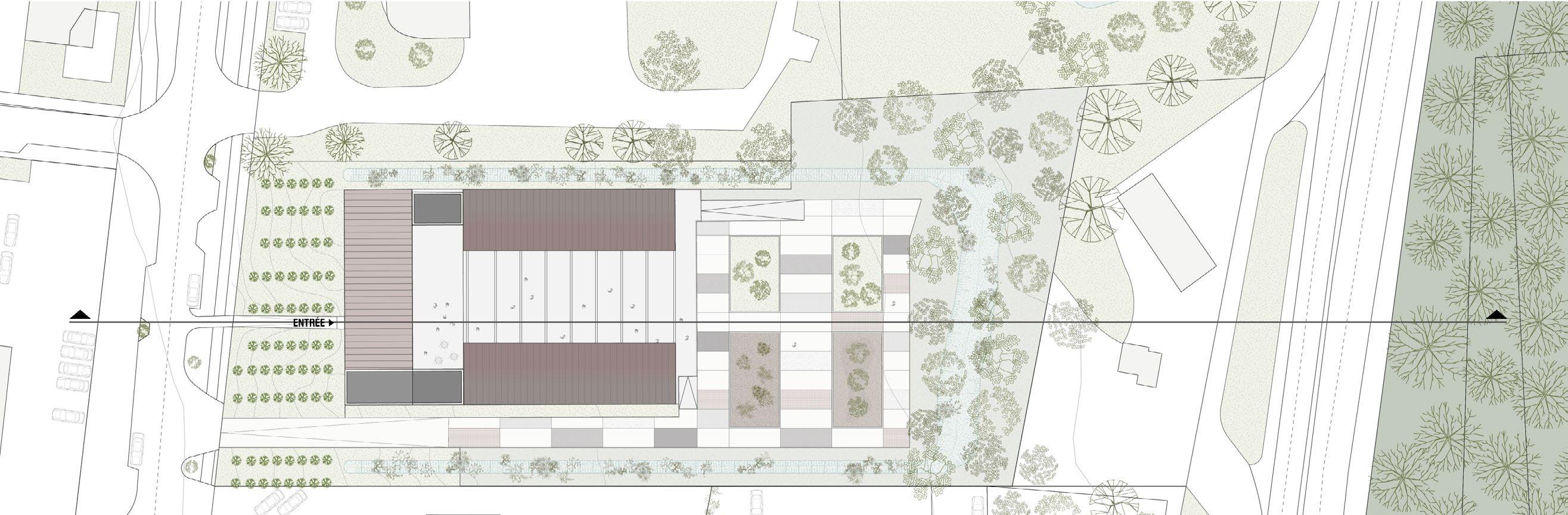 All run-off water from the roofs will be collected in the open air and channelled into the two vegetated valleys. These structures are designed to encourage retention and direct infiltration, while ensuring that excess water is channelled to outlets connected to the public sewer system outside the site. A drain at the bottom of the ditch ensures drainage when the substrate reaches saturation point.
