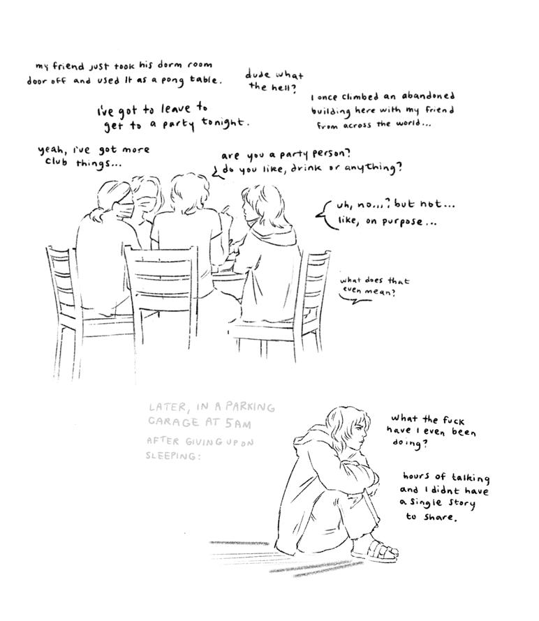 It was easier for me to alleviate this fear of going out, the difficulties of talking to new people, dissolve that knot in my stomach... by just staying in and clinging to the few people I was already comfortable with. By the end of my second year of college, I realized I barely had any new friends. I was letting things happen to me, waiting for things to happen to me.
