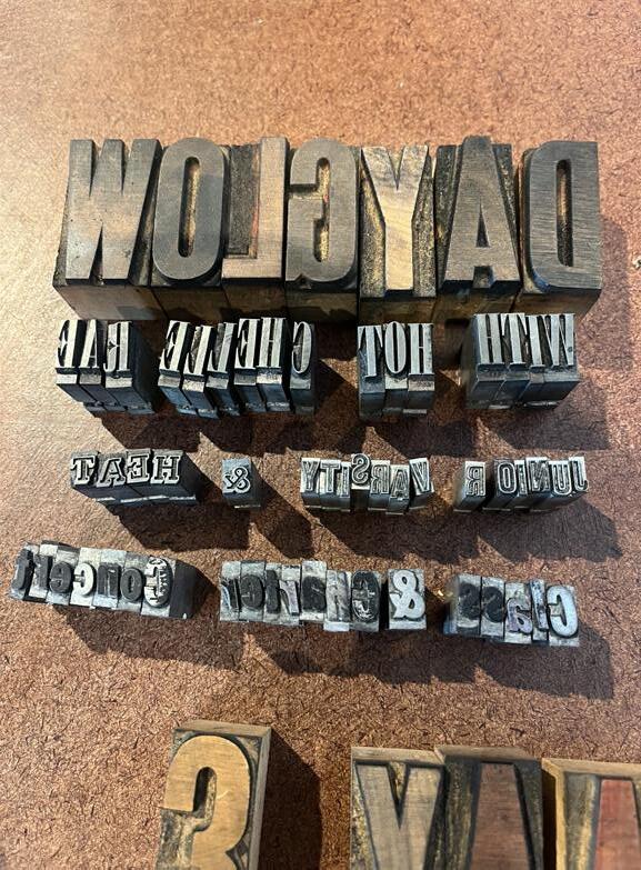 When I arrived at First Proof, I shared my digital sketch with the staff and discussed my options. Luckily, they had a bold wooden font that looked like many of the fonts on Hatch posters that I wanted to emulate. I started with this as the artist’s title. I then went to the many text drawers, sitting on the floor meticulously picking out each letter for all the information needed for my poster. I collected all of my letters and organized them in order (see Fig.1 pg. 18). I wanted to visualize the year in a specific way so that all the text lined up. To do that, I needed to carve my block. I carved a linoleum block to say 2024 and used the wooden type to guide my shape (see Fig. 2). Once this block was carved, I was ready to organize my final composition. Apart from setting each letter, I used spacers and “furniture” (small blocks that sit lower