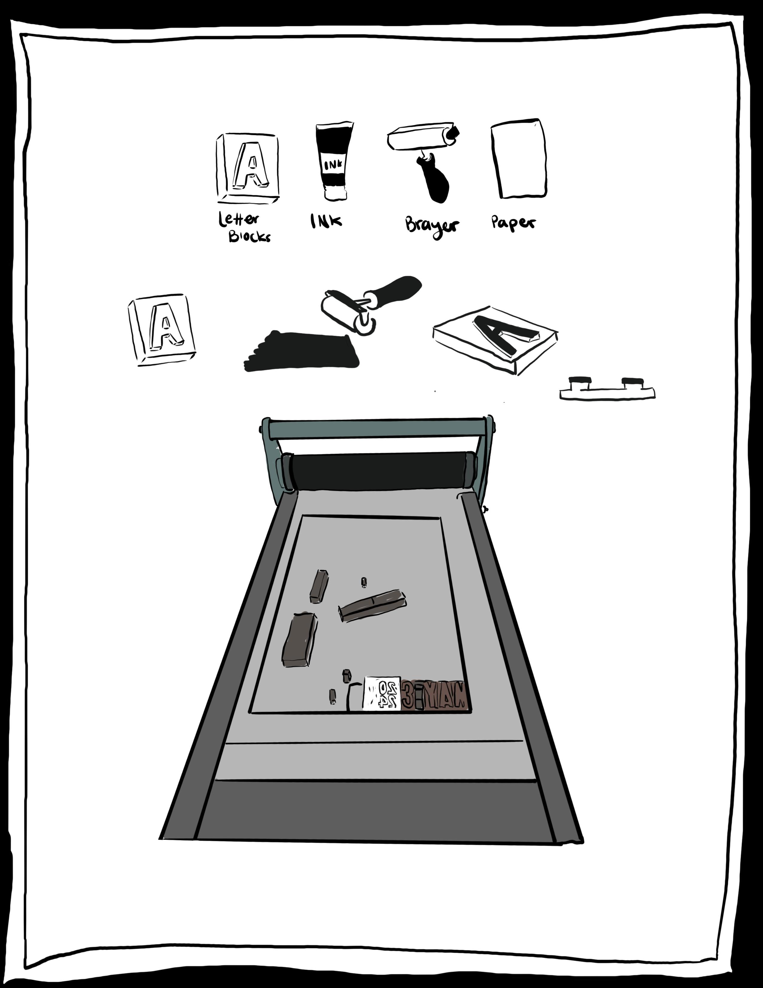 In addition to making a poster, I wanted to think about the medium of printmaking and the materiality of the process for my research. As described earlier, the letterpress printmaking process is tedious and very different from using Photoshop to make posters, as I usually do. However, learning this process by hand would benefit my understanding of my topic. Printmaking is also a community-based medium; working as a team and learning from master printers is part of the process. In this way, my becoming part of a printmaking community (if only briefly) would also benefit my understanding of the letterpress process.