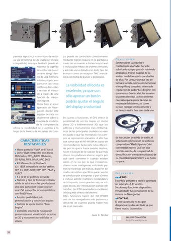 Valoración rrrPROS Su precio que pese a todo lo aportado no supera los 1.415 euros. Secciones y funciones disponibles. Versatilidad y funcionamiento de su sistema de Navegación. rCONTRAS El que su pantalla no sea por desgracia extraíble del todo ya que llama mucho la atención.