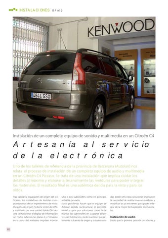 Artesanía al servicio de la electrónica Uno de los talleres de referencia de la provincia de Barcelona (Autolan) nos relata el proceso de instalación de un completo equipo de audio y multimedia en un Citroën C4 Picasso. Se trata de una instalación que implica cuidar los detalles al máximo y elaborar artesanalmente las molduras para poder integrar los materiales. El resultado final es una auténtica delicia para la vista y para los oídos. Tras valorar la equipación de origen del C4 Picasso, los instaladores de Autolan comprueban más de un impedimento de inicio. El equipo de origen no tiene lector de DVD, y sustituirlo por una unidad doble DIN dejaría sin funcionar el display de información del coche. Además, las plazas 6 y 7 situadas en la zona del maletero impiden montar