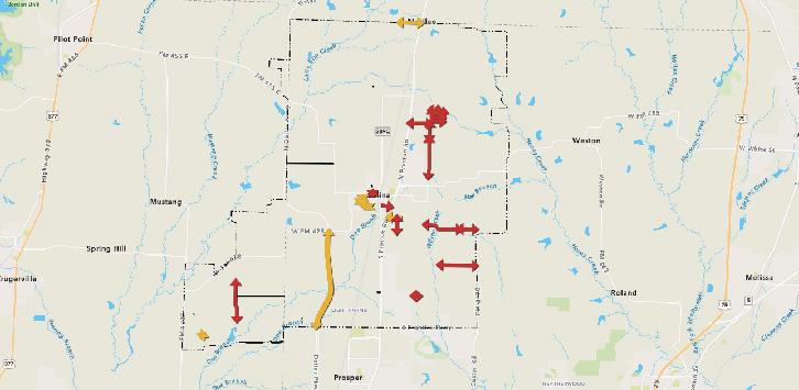 • The northbound and southbound left lane of Dallas Pkwy from First St to FM 428 will be closed daily from 6:30 AM to 6:30 PM.