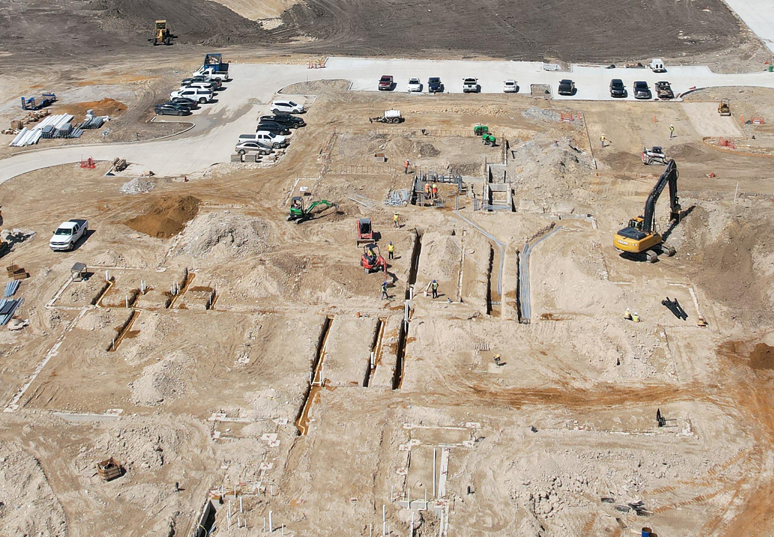 As of April 2023, the underground plumbing and electrical is currently being installed, which includes the underground sleeve for electrical/data needed for future emergency siren on the southeast corner. Grade beams are being formed on the west side of the main building and the east side grade beams will be poured. In addition, subgrade preparation and pouring of the fire lanes has begun.