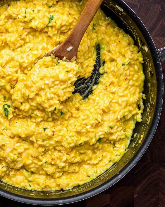 • Agrega unas hebras de azafrán al arroz y luego comienza a agregar el caldo caliente, una taza a la vez, revolviendo constantemente y esperando a que se absorba antes de agregar más.