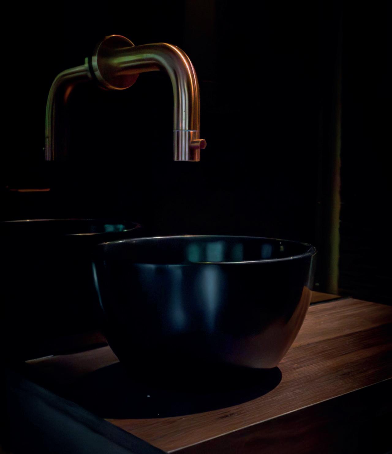 De wanden van het toilet zijn bekleed met een donkere bronzen spiegel. de spiegel geeft de ruimte een infinity mirror effect.