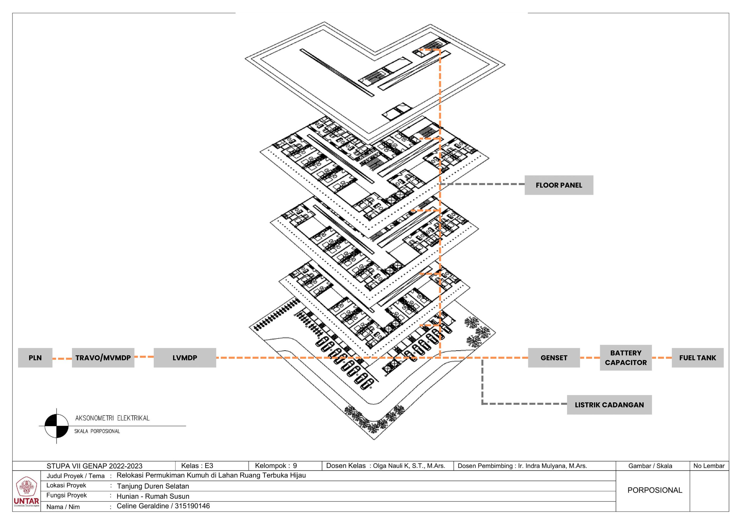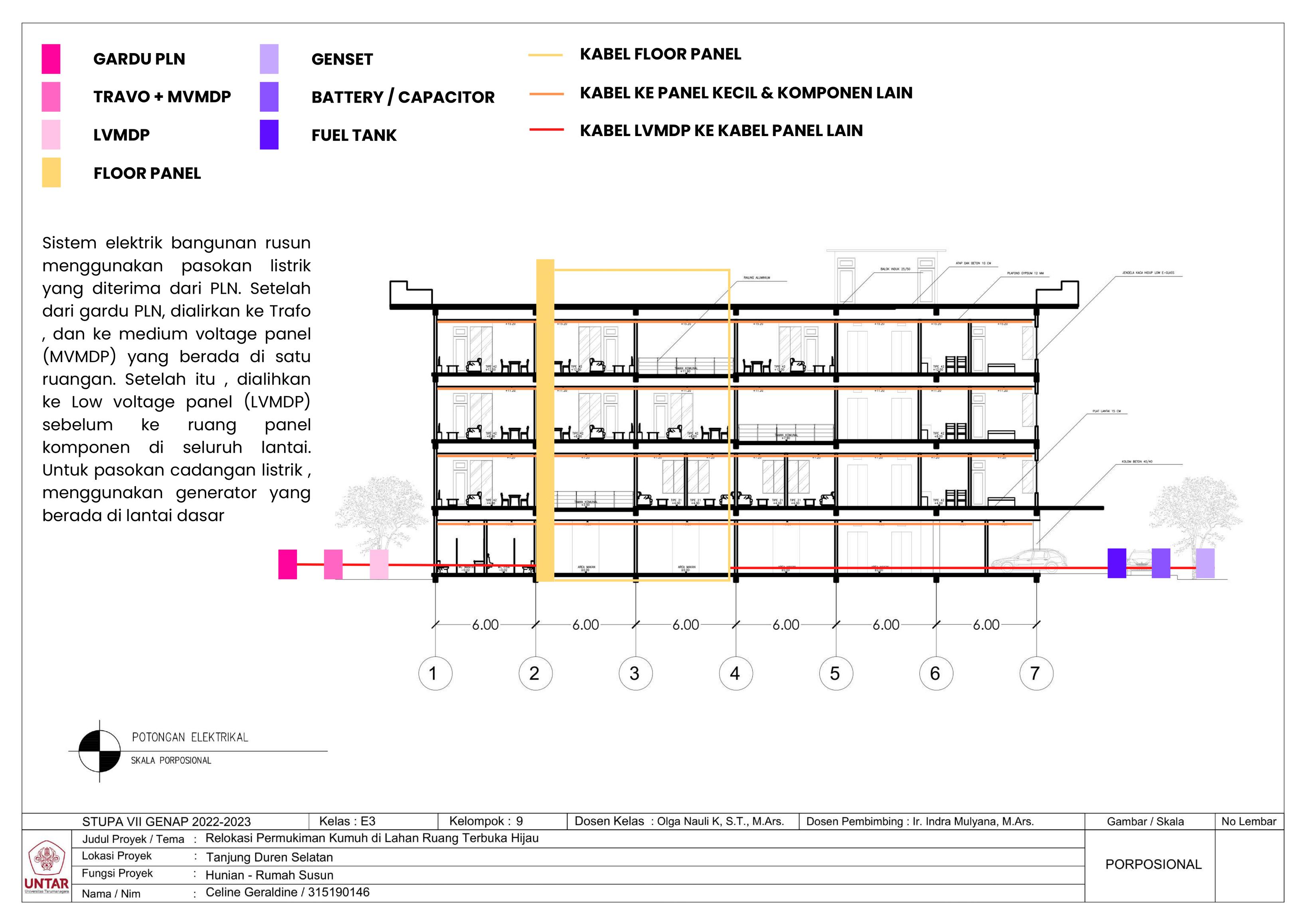 Sistem elektrik bangunan rusun menggunakan pasokan listrik yang diterima dari PLN. Setelah dari gardu PLN, dialirkan ke Trafo , dan ke medium voltage panel (MVMDP) yang berada di satu ruangan. Setelah itu , dialihkan ke Low voltage panel (LVMDP) sebelum ke ruang panel komponen di seluruh lantai. Untuk pasokan cadangan listrik , menggunakan generator yang berada di lantai dasar