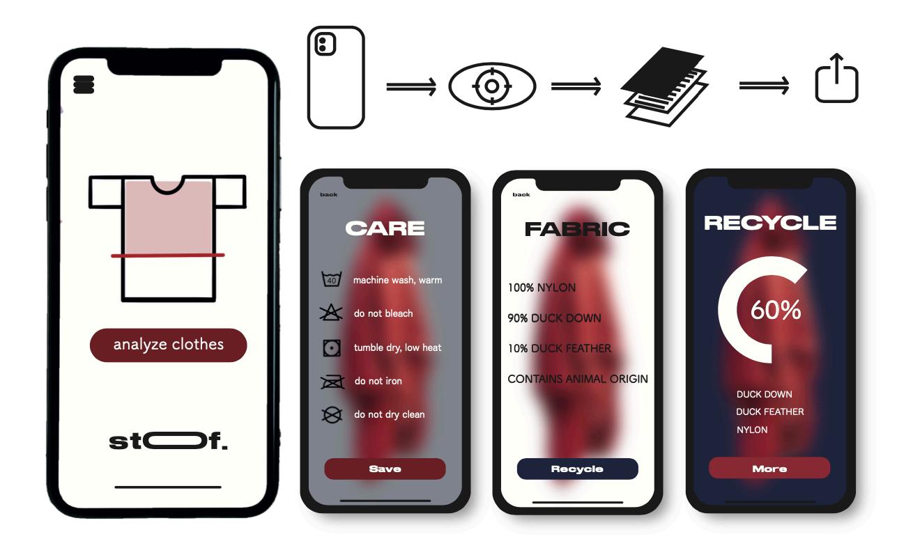 Making an app that can help slow down the fast fashion industry is the main goal of the design concept. We want consumer to be more considerate and aware before purchasing an item of clothing, wearing the item, and what Save happens to the clothing when they don’t want it anymore. The idea is to use AI visual recognition to detect the material of your clothing, AI will match the fabric to an existing fabric database. With this information, user can determine how to recy- cle, how to take care of the apparel. stof.