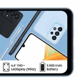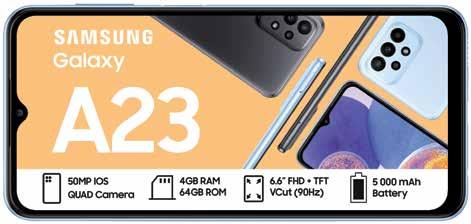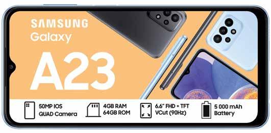 HAS AFRICA SAMSUNG Summer Spin Your World Promotion ends 31 January 2023. Offers valid from 1 December 2022 - 13 February 2023 while stocks last. Standard RICA process applies. Once-off SIM and connection fee of R199 applies to all contracts. All prices and usage rates advertised include VAT unless otherwise stated. Please check in-store or online for colour availability of devices. For Pinnacle Top Up Terms & conditions, see page 20/21 of this Connector Book. *The Free 10GB once-off extra data on selected deals is valid for 30 days from the date of activation. The Watches can only be added to deals as specified. Cell C reserves the right to cancel or extend any deal or promotion without notice. E&OE. For full Terms and Conditions, visit cellc.co.za or ask in-store. 512MB ANYTIME DATA 512MB NITE DATA 30 ANY-NET MINS 30 ON-NET MINS UNLIMITED SMS* PINNACLE 1GB TOP UP 1.5GB ANYTIME DATA 512MB NITE DATA 60 ANY-NET MINS 120 ON-NET MINS UNLIMITED SMS* PINNACLE 2GB TOP UP LIMITED STOCK ON ALL DEVICES 120MB DATA SIM COVER PAY BILL ASSIST VALID FOR 30 DAYS*** R49 MONTHLY FEE 400MB DATA SIM COVER PAY BILL ASSIST VALID FOR 30 DAYS*** R89 MONTHLY FEE CHOOSE FROM THESE TWO OPTIONS PAY BIL L A SSIS T THE FIRST-OF-ITS-KIND BUNDLE THAT PROTECTS YOUR FAMILY AND SETTLES YOUR CELLPHONE BILL IN THE EVENT THAT YOU NO LONGER CAN. IF SOMETHING HAPPENS AND YOU CAN’T PAY, CELL C PAY BILL ASSIST CAN! Terms and Conditions apply. *Calendar month validity. Recurring bundle. 120MB DATA SIM COVER PAY BILL ASSIST VALID FOR 30 DAYS*** R49 MONTHLY FEE 400MB DATA SIM COVER PAY BILL ASSIST VALID FOR 30 DAYS*** R89 MONTHLY FEE CHOOSE FROM THESE TWO OPTIONS PAY BIL L A SSIS T THE FIRST-OF-ITS-KIND BUNDLE THAT PROTECTS YOUR FAMILY AND SETTLES YOUR CELLPHONE BILL IN THE EVENT THAT YOU NO LONGER CAN. IF SOMETHING HAPPENS AND YOU CAN’T PAY, CELL C PAY BILL ASSIST CAN! Terms and Conditions apply. *Calendar month validity. Recurring bundle. MONTHS 24 189 SAMSUNG GALAXY A04 32GB SAMSUNG GALAXY A23 64GB MONTHS 22924 16 249 FREE 10GB ONCE-OFF EXTRA DATA* VALID FOR 30 DAYS SAMSUNG GALAXY S21 FE MONTHS 27924 MONTHS 22936 FREE 10GB ONCE-OFF EXTRA DATA* VALID FOR 30 DAYS MONTHS 64924 MONTHS 49936 FREE 10GB ONCE-OFF EXTRA DATA* VALID FOR 30 DAYS MONTHS 24 599 MONTHS 39936 UPSIZE YOUR DEAL FOR A LITTLE MORE TO GET YOUR FAVOURITE PHONE WITH DOUBLE THE VALUE.