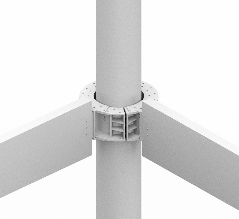 2) Inserts in the steel plate enable prestressed bolts to be directly bolted into the concrete column, the rounded steel plate can then be slotted into the bolts and help up.