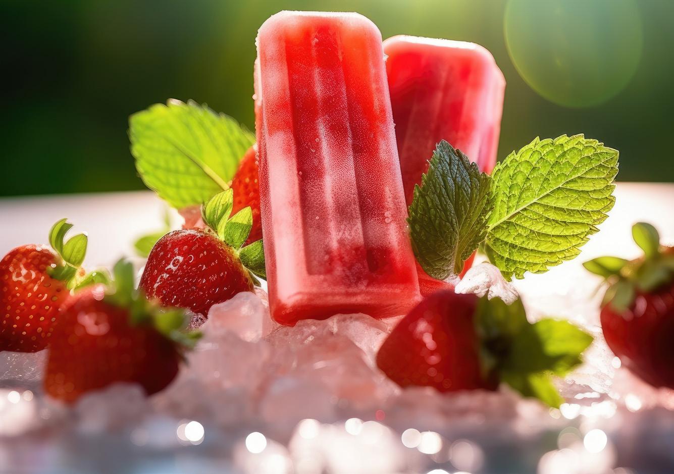 Separe uma xícara das frutas e corte-as em rodelas. Bata o restante dos ingredientes no liquidificador, com adoçante a gosto. Coloque pedaços das frutas nas forminhas e complete com a mistura batida. Leve ao freezer.