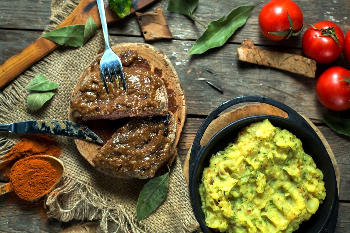 Fatie a carne e sirva com o purê de couve-flor ao lado.