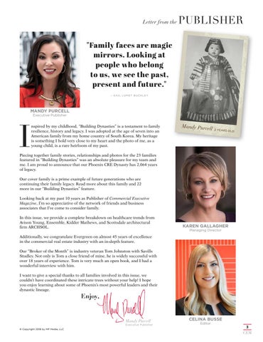 Piecing together family stories, relationships and photos for the 23 families featured in “Building Dynasties” was an absolute pleasure for my team and me. I am proud to announce that our Phoenix CRE Dynasty has 2,064 years of legacy. Our cover family is a prime example of future generations who are continuing their family legacy. Read more about this family and 22 more in our “Building Dynasties” feature. Looking back at my past 10 years as Publisher of Commercial Executive Magazine, I’m so appreciative of the network of friends and business associates that I’ve come to consider family. In this issue, we provide a complete breakdown on healthcare trends from Avison Young, Ensemble, Kidder Mathews, and Scottsdale architectural firm ARCHSOL.