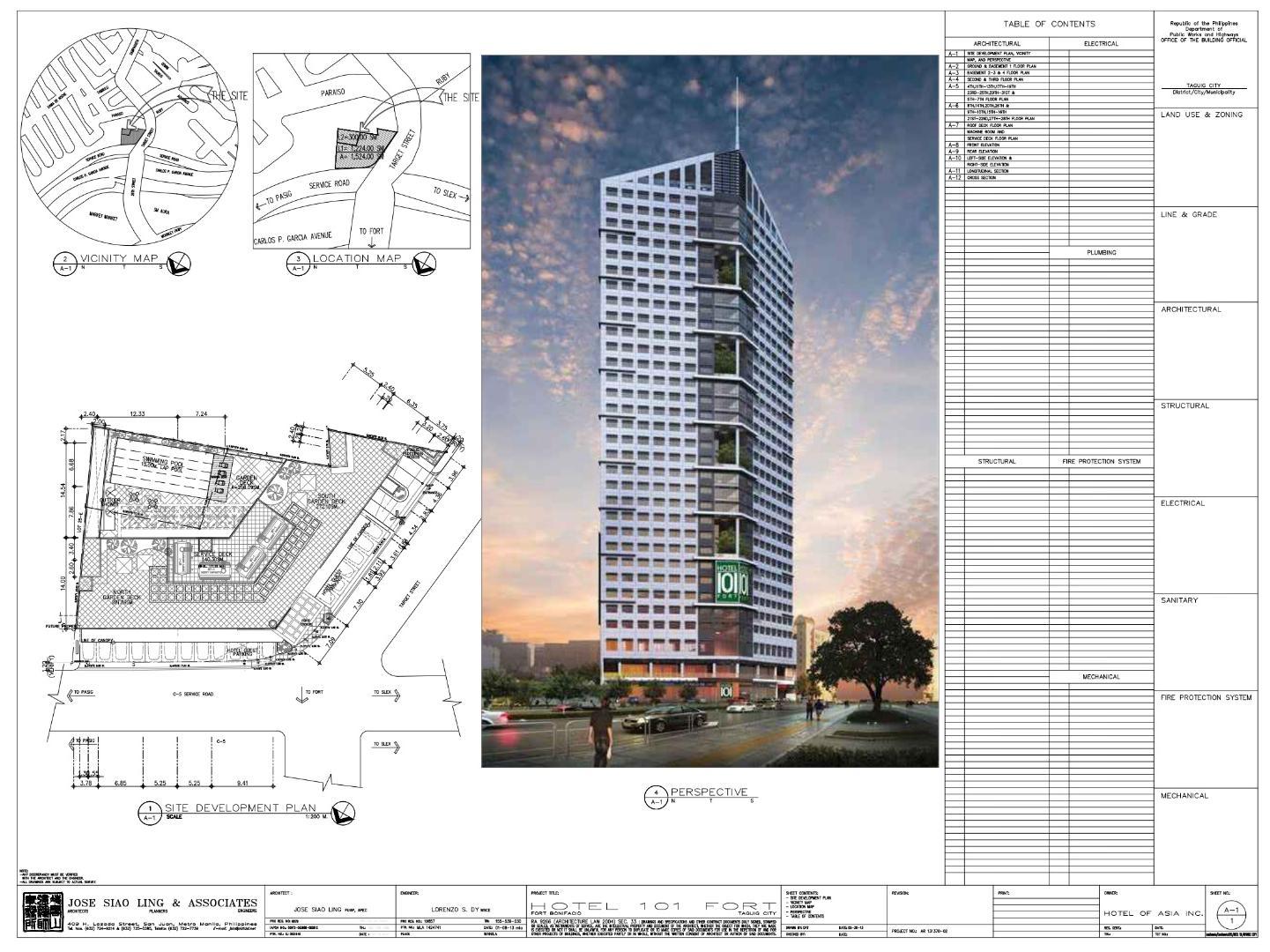 HOTEL 101 FORT is a 33-storey 3 star hotel. It stands on a viable 1,224.00 sq. meters corner lot bounded by C-5 Road and Target street. It has a total gross floor area of 24,000.00 sq. meters with five basements comprising of 209 parking slots, four levels, twenty seven floors of hotel units, garden deck and service decks that has a spectacular view of the Bonifacio Global City, Makati City and Taguig City