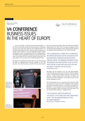 V4 Conference business issues in the heart of Europe It was in Visegrad – a small town in the north of Hungary – in the XIVth century that the idea of Central European cooperation was born. Over 600 years after the first Visegrad summit, the Visegrad Group (abbreviated V4) unites the region, being now an alliance of four countries – the Czech Republic, Hungary, Poland and Slovakia. At the very beginning of the 2011 spring semester, the CEMS Community gathered in Warsaw to discuss the business issues of the region for the first edition of the V4 Conference, the latest addition to the annual roster of CEMS Regional Events. Participants were guided through the whole way of understanding the idea of competitiveness, focusing strongly on the CEE countries. The scientific journey started with a macroeconomic