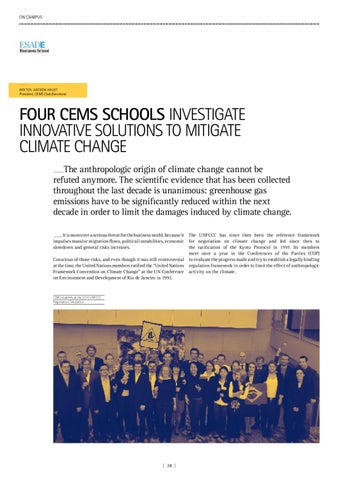Four CEMS schools investigate innovative solutions to mitigate climate change The anthropologic origin of climate change cannot be refuted anymore. The scientific evidence that has been collected throughout the last decade is unanimous: greenhouse gas emissions have to be significantly reduced within the next decade in order to limit the damages induced by climate change. It is moreover a serious threat for the business world, because it impulses massive migration flows, political instabilities, economic slowdown and general risks increases. Conscious of those risks, and even though it was still controversial at the time, the United Nations members ratified the “United Nations Framework Convention on Climate Change" at the UN Conference on Environment and Development of Rio de Janeiro in 1992.