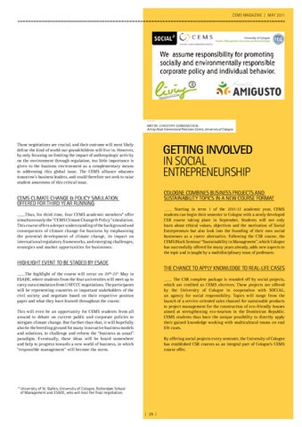 Starting in term 1 of the 2011-12 academic year, CEMS students can begin their semester in Cologne with a newly developed CSR course taking place in September. Students will not only learn about ethical values, objectives and the motivation of Social Entrepreneurs but also look into the founding of their own social businesses as a career alternative. Following the CSR course, the CEMS Block Seminar “Sustainability in Management”, which Cologne has successfully offered for many years already, adds new aspects to the topic and is taught by a multidisciplinary team of professors.