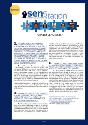 disciplines and inspire people to make a difference through social entrepreneurship. We will be bringing SENS to life by solving social problems in two main ways on the platform. First, we will create a network of positive people willing to stop for a moment and find social business opportunities in the problems they face and develop social entrepreneurial solutions to solve The entire CEMS community can join us to find the help them. Second, we will inspire people by providing and talent they need to achieve the goals of the Global positive news about the social achievements of our Value Statement by developing social business projects entrepreneurs and partners. Through our partnership with CEMS, we have an instant global reach and we at SENStation. are now one step closer to spreading the philosophy of bringing SENS to life and confidence to people.