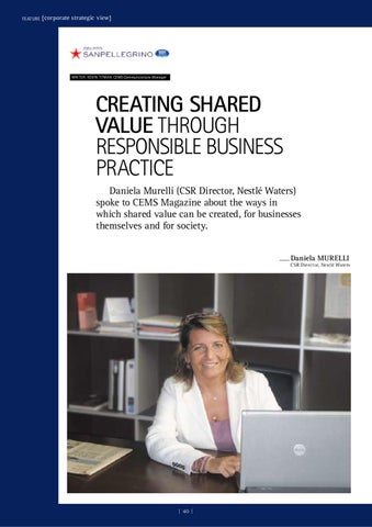 Creating shared value through responsible business practice Daniela Murelli (CSR Director, Nestlé Waters) spoke to CEMS Magazine about the ways in which shared value can be created, for businesses themselves and for society.