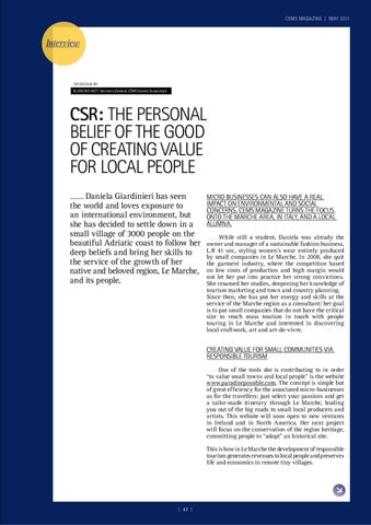 CSR: THE PERSONAL BELIEF OF THE GOOD OF CREATING VALUE FOR LOCAL PEOPLE Daniela Giardinieri has seen the world and loves exposure to an international environment, but she has decided to settle down in a small village of 3000 people on the beautiful Adriatic coast to follow her deep beliefs and bring her skills to the service of the growth of her native and beloved region, Le Marche, and its people. Daniela GIARDINIERE CEMS 2007 (NHH-ESADE)
